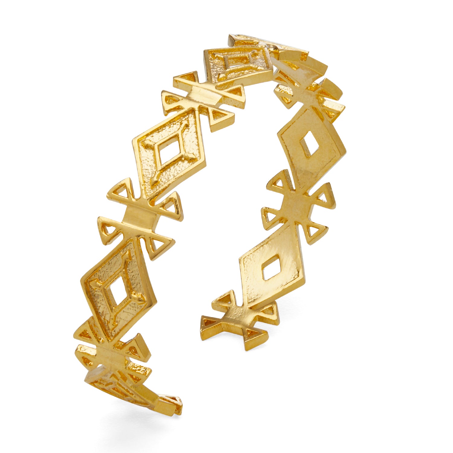 Handcrafted in 22k gold-plated brass, the Safa Bracelet celebrates the rhythm and geometry of tilework and traditional artisan jewellery. Its open-ended, adjustable design features a repetitive diamond filigree pattern — a motif that reflects the balance and texture central to the Souk collection.